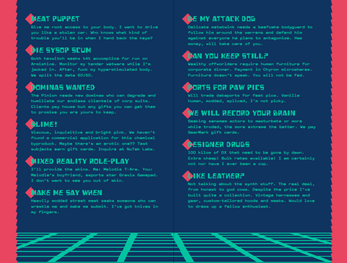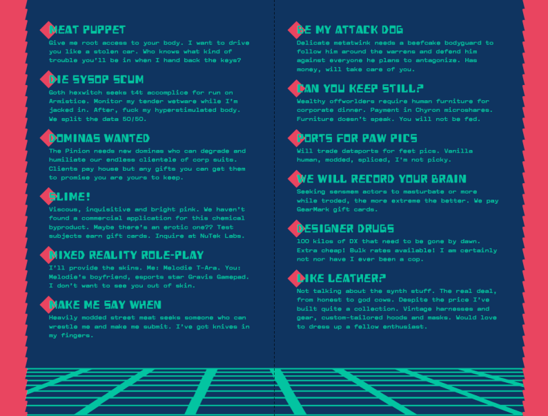 CONTENT WARNINGS: This zine is interested in sex work and many of the scenarios within are presented as transactional or exploitative. There are ambiguously consensual or consensually non-consensual scenarios. Drug use is mentioned several times. Many of the activities being solicited are understood in the fiction to be illegal, and some entries are implied to have been posted by police. This writing is sexually explicit.