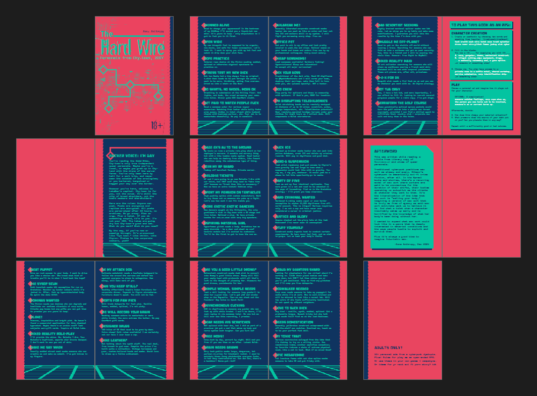 It's 20XY. Between the sprawl of server farms and the shores of a dried lake gleams Chy-town, the crown jewel of LakeSec. In the shadow of the corporate arcologies, queers hustle to make ends meet. Spliced, modded, construct or vanilla, the Hard Wire – Chy-town's anonymous, encrypted feed of queer personals – are here for you. Praise to the corporate masters.