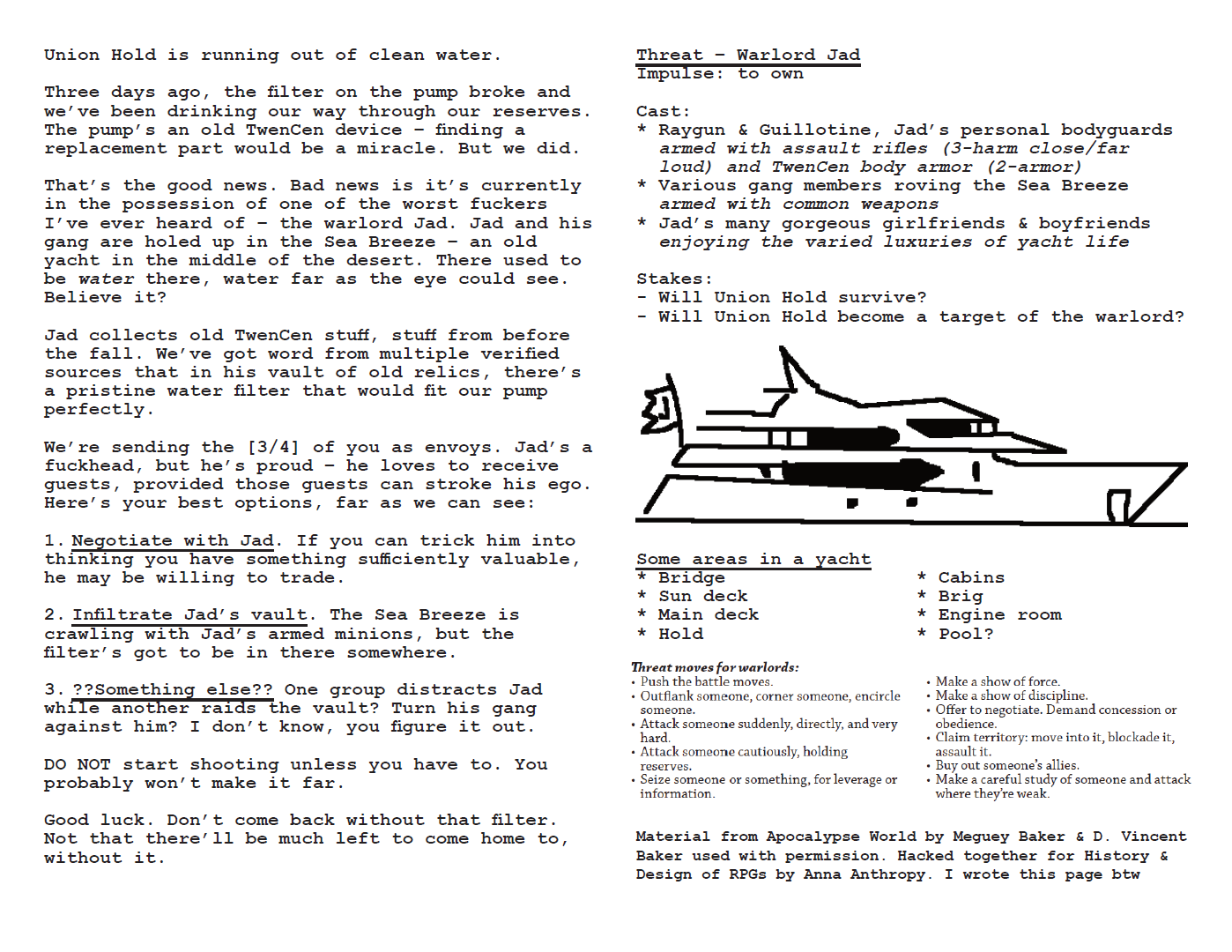 Thanks to Meg and Vincent Baker for allowing me to distribute material from Apocalypse World in this way. Most of the material in the packets is from handouts available on apocalypse-world.com. The first sheet of the Emcee packet, introducing the scenario, was written by me for this exercise. (I also drew the yacht.)